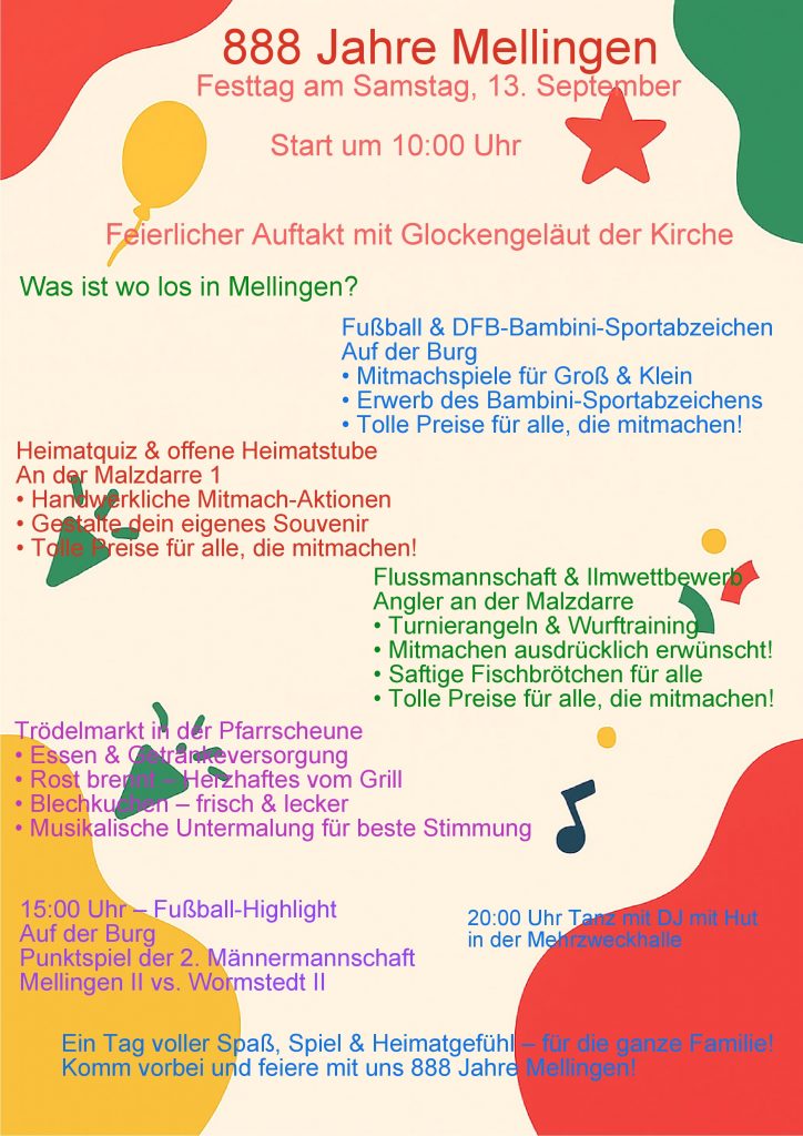 Was für ein Fest! Die 888-Jahrfeier Mellingens vom 12. bis 14. September 2025 war ein voller Erfolg – drei Tage voller Freude, Gemeinschaft und großartiger Momente, die uns noch lange in Erinnerung bleiben werden.