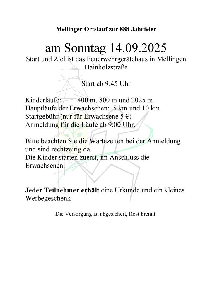 Im Rahmen der 888-Jahrfeier fand am Gerätehaus der Freiwilligen Feuerwehr Mellingen der Ortslauf statt. Insgesamt nahmen 122 Läuferinnen und Läufer aus Mellingen und der Umgebung teil. Bei trockenen Bedingungen und angenehmen Temperaturen herrschten beste Voraussetzungen für die Veranstaltung.