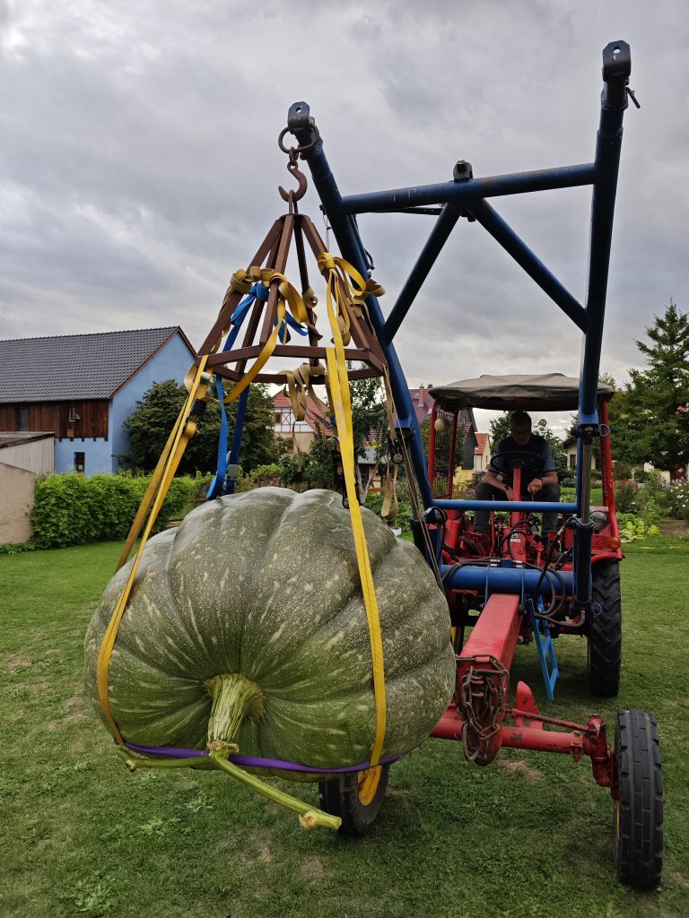 André Geist aus Mellingen hat in diesem Jahr einen grünen Riesenkürbis gezüchtet. Nach Angaben von Matthias Händel (ebenfalls Mellingen), von welchem auch die Jungpflanze stammt, bekommen grüne Kürbisse mehr Masse als gelb- oder organgefarbene.