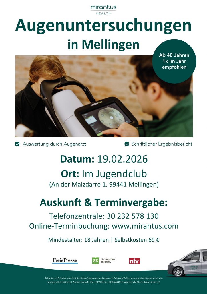 Mirantus Augenmobil am 19.02. erneut in Mellingen Im Dezember machte das Mirantus Augenmobil zum ersten Mal Station in Mellingen, um den Bürgern wohnortnahe Augenuntersuchungen zu ermöglichen. Das Projekt dient einem verbesserten Zugang zu Gesundheitsversorgung und stieß im Ort auf große Nachfrage. Nach der Untersuchung erhielten die Teilnehmer einen schriftlichen Ergebnisbericht, digital ausgewertet vom Augenarzt – ohne weite Anfahrtswege oder lange Wartezeiten in Kauf nehmen zu müssen. Ab 40 Jahren wird eine jährliche Augenvorsorge empfohlen. Gerade im ländlichen Raum ist es jedoch oft eine Herausforderung, einen Termin beim Augenarzt zu bekommen. Das Augenmobil schafft dafür eine neue Lösung: Wohnortnahe Augenuntersuchungen inkl. Überprüfung der Brillenwerte, Augeninnendruckmessung, Netzhaut- und Spaltlampenaufnahme und schriftlicher Ergebnisbericht vom Augenarzt. Angesichts der positiven Resonanz steht nun ein Wiederholungstermin fest: Am 19.02.2026 werden im Jugendclub (An der Malzdarre 1, 99441 Mellingen) erneut Augenuntersuchungen angeboten. Auskunft & Terminvergabe: Die Terminvergabe ist ab sofort telefonisch unter +49 30 232 578 130 oder online unter www.mirantus.com möglich. Die Selbstkosten (69 €) können vor Ort bar oder mit Karte bezahlt werden. Das Angebot richtet sich an Personen ohne akute Augenbeschwerden, Mindestalter 18 Jahre.